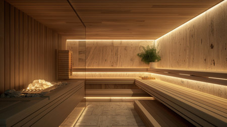 Modern Indoor Spa Sauna with Warm Lighting and Wooden Benches.