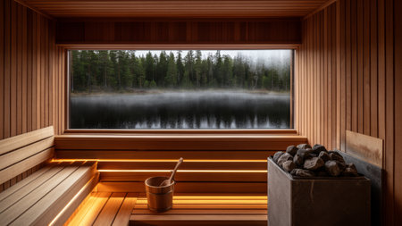 Inside a cozy sauna, warm light gently illuminates wooden benches. A stunning view of a mist-covered lake and trees creates a peaceful atmosphere perfect for relaxation.
