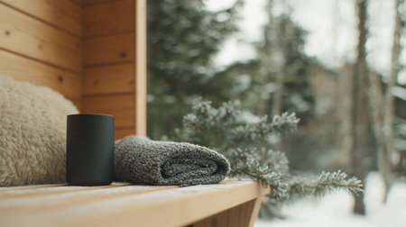 Cozy winter retreat with a warm beverage, soft blanket, and tranquil nature backdrop in a rustic wooden setting, perfect for relaxation and self care