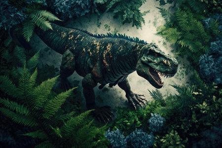 Ferocious Tyrannosaurus Rex Dinosaur Roaring Fiercely, Surrounded by Lush Prehistoric Jungle Foliage