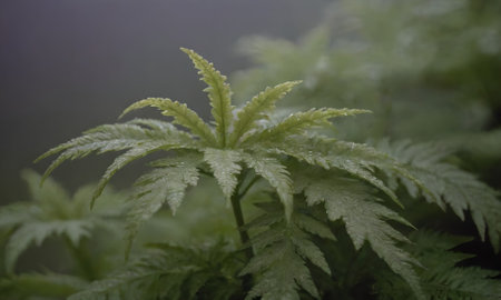 This captivating image depicts a lifelike dinosaur in a serene prehistoric forest, surrounded by lush ferns and enveloped in soft mist, creating an ethereal ambiance.