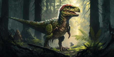 A stunning depiction of a dinosaur in a lush prehistoric jungle, surrounded by vibrant foliage and bathed in soft sunlight, evoking a sense of adventure.