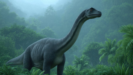 This stunning image captures a majestic dinosaur standing in a lush, misty forest, inviting viewers to explore the wonders of a prehistoric world filled with vibrant greenery.
