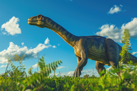 This captivating image depicts a lifelike dinosaur in a serene prehistoric forest, surrounded by lush ferns and enveloped in soft mist, creating an ethereal ambiance.