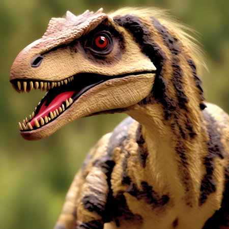 A close-up of a velociraptor with its mouth open, showing sharp teeth