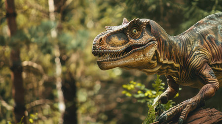 A lifelike dinosaur model, possibly a velociraptor or a similar type, is posed in a forest setting. Its head is turned slightly to the side, with its mouth slightly open, revealing sharp teeth. The model's scaly skin is intricately detailed, and its eyes appear lifelike. The background features blurred greenery, suggesting a lush, prehistoric environment.
