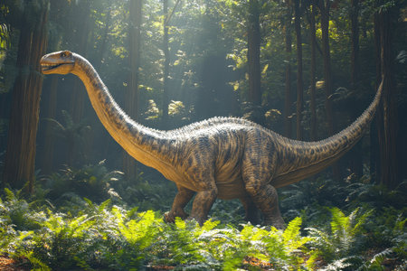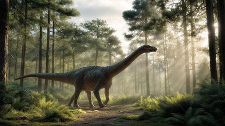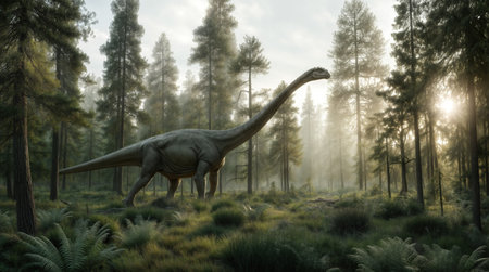 An Argyrosaurus dinosaur with a long neck and tail standing in a misty prehistoric forest surrounded by tall trees and lush vegetation, illuminated by soft sunlight, showcasing its majestic natural habitat.