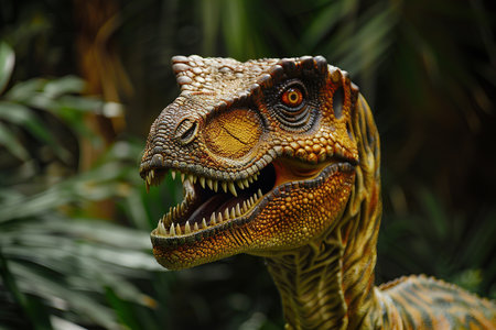 A detailed close-up view of a dinosaur with its mouth wide open. This image can be used to depict prehistoric creatures, dinosaur exhibitions, educational materials, or for adding an element of adventure to creative projects.