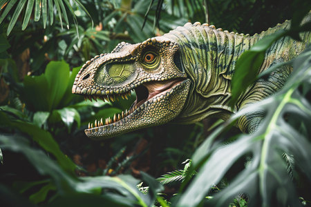 This captivating image features a lifelike green dinosaur standing amidst lush jungle vegetation, showcasing intricate scales and immersive details.