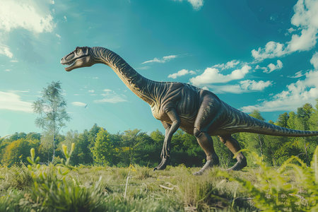 View of giant brontosaurus dinosaurs in an ancient environment. Ancient creatures in their natural habitat. Prehistoric natural landscape with dinosaurs