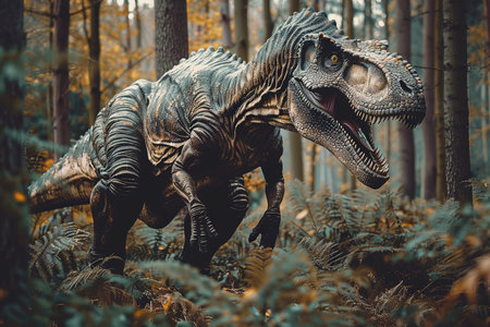 Ferocious Tyrannosaurus Rex Dinosaur Roaring Fiercely, Surrounded by Lush Prehistoric Jungle Foliage