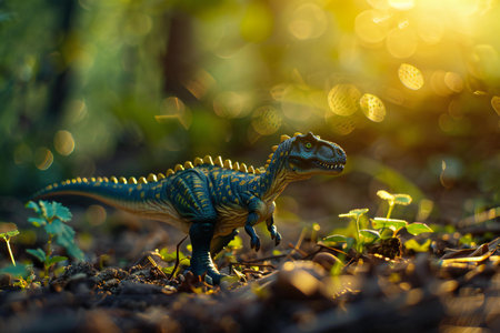 Tyrannosaurus rex dinosaur toy in the forest at sunset