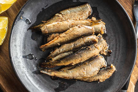 Smoked sprats on plate. Canned sea fish. Top view.