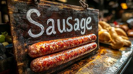 A detailed image of two sausages in front of a rustic wooden sign bearing the word 'Sausage,' capturing a market or food stall ambiance with vibrant colors and textures.