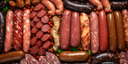 Lots of different sausages and sausages background. from different varieties of sausage. A variety of meat products. ai generative