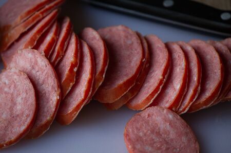 sliced sausages on chopping board. Sliced sausage on the board.