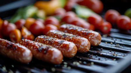 Delight in the sight of freshly cooked sausages arranged on a grill in a modern kitchen setting, capturing the essence of culinary craftsmanship and vibrant flavors.
