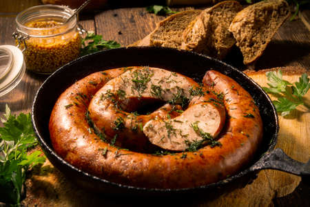 Traditional homemade sausage with herbs, bread mustard in a cast iron pan