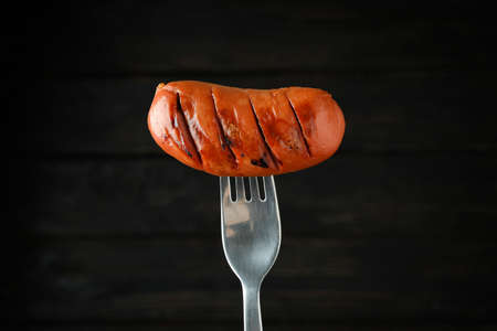 Fork with grilled sausage on wooden background