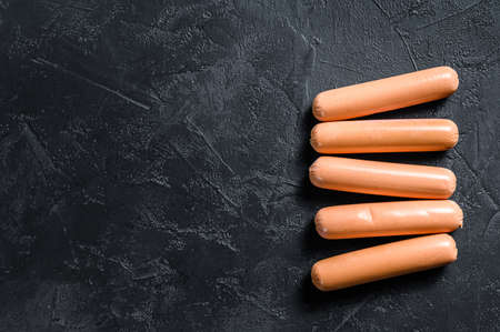 Classic boiled meat pork sausages. Black background. Top view. Copy space.