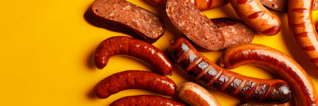 Assorted handcrafted sausages, rich in detail, fading into a smooth mustard-yellow gradient. Generative AI