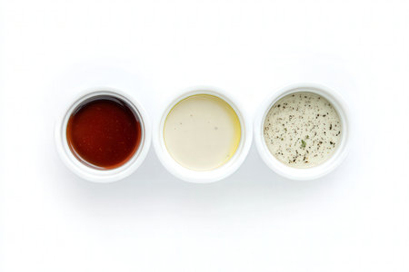 horizontal banner, set of small round saucers with different sauces for meat, fish and fast food, row, top view, white background, copy space, free space for text