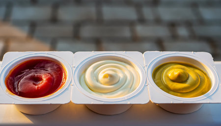 three variants of ketchup, mustard and mayonnaise sauce