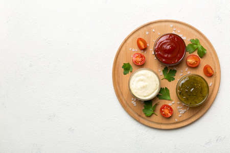 Three kinds of red tomato sauce on a white stone table: traditional classic ketchup, barbecue sauce, sweet and sour Chinese sauce. Top view copy space