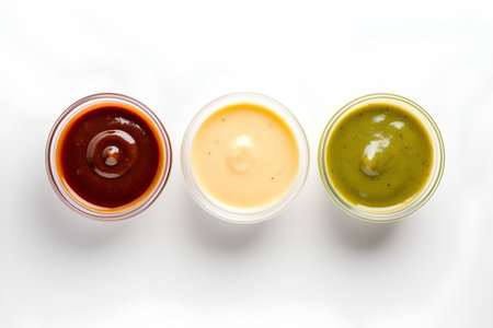 A selection of colorful sauces in small rustic bowls, artfully arranged on a clean white surface, viewed from above, perfect for culinary presentations