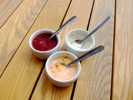 several sauces of European cuisine. Several sauces : mayonnaise, ketchup, horseradish. Top view on european cuisine food on wooden background.