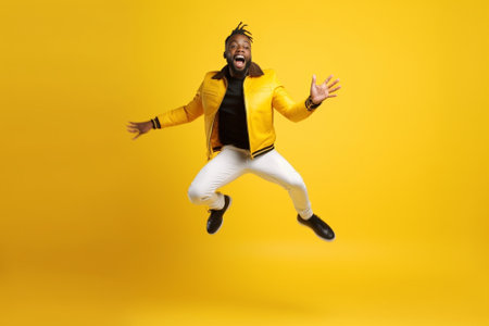 Young black man jumping energetically in the middle of the street in a big city. He has an afro hairstyle and dresses casually. Space for text.