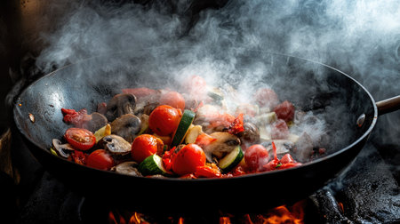 A visually stunning image of fresh vegetables frying in a wok pan, with red tomatoes, mushrooms, and zucchini sizzling amidst smoke and fire, showcasing the essence of flavorful cooking.