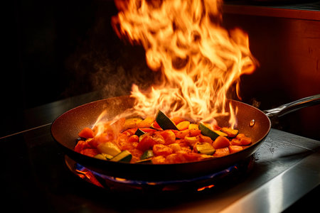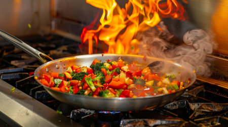A lively kitchen captures the moment as colorful vegetables ignite into flames, creating an exhilarating spectacle. Chefs expertly manage the heat while flavors combine in this culinary performance.