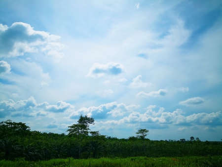 Cloudy blue sky above oil palm plantation in the sunny day.