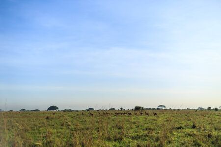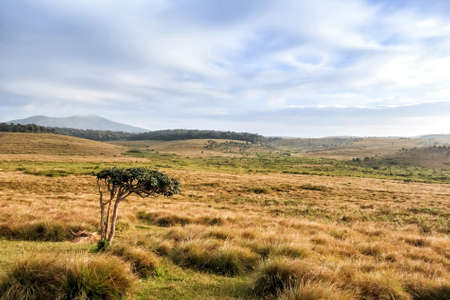 Nyika plateau, Malawi, Africa: rolling landscape with hills, grass, plains and sky with clouds. Travel and tourism during safari trip