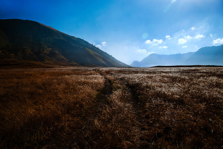Mountain and savannah field with cloud and blue sky. Rinjani mountain, Lombok island, Indonesia.