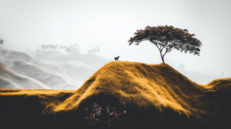 Tranquil scenery of a single tree on a sun-kissed grassy mound with a small animal silhouette. Misty mountains fade into the bright overcast sky.