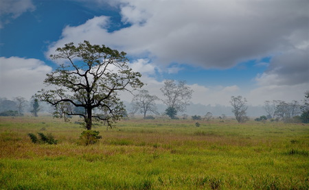 Beautiful landscape with lonely tree on the meadow under cloudy sky