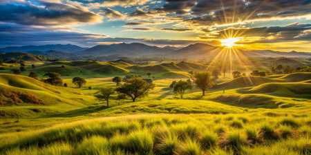 Experience a stunning sunrise over rolling hills adorned with vibrant grasslands and enveloped in soft mist, capturing the essence of tranquility in nature's embrace.