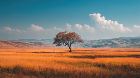A stunning landscape showcasing a solitary tree against a vibrant golden field, highlighted by a clear blue sky and fluffy white clouds, evoking tranquility.