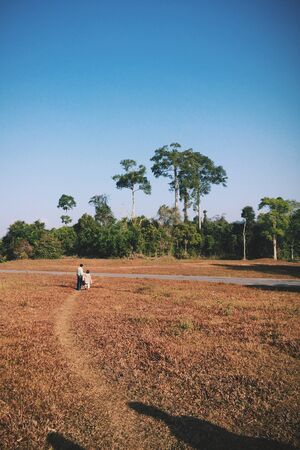 This image captures a tranquil savannah landscape featuring sparse trees under a clear blue sky. The vastness of the dry terrain evokes a serene and peaceful atmosphere.