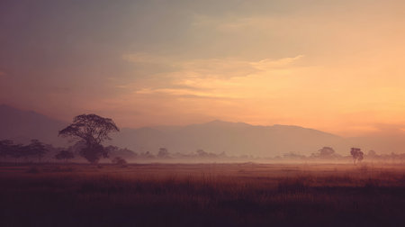 This stunning image captures a tranquil landscape at dusk, featuring silhouetted trees against a misty horizon and soft pastel skies, perfect for nature lovers.