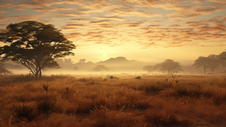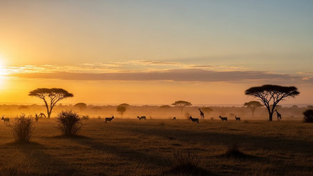 A breathtaking panorama of the African savanna at sunrise, showcasing a golden sky, lush vegetation, and a gentle haze creating a serene atmosphere