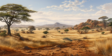 Stunning view of golden grasslands featuring scattered trees under a vibrant sky with fluffy clouds, embodying the serene beauty of the African savannah landscape.