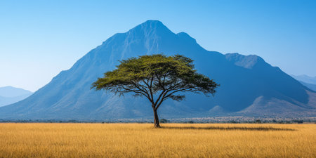 A solitary tree stands in a vast golden grassland with a majestic mountain rising in the background under a clear blue sky. The tranquil scene embodies natural beauty and serenity.