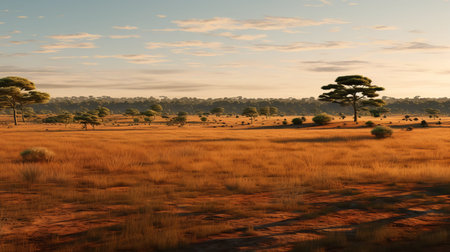 a big area of land with trees and a sun shining brightly in a sky painted in vibrant red hues. this stunning scene, reminiscent of australian landscapes, showcases serene pastoral beauty. the detailed hunting scenes and hyper-realistic renderings, created in the style of unreal engine 5, add a touch of golden warmth to this captivating image. ai generated