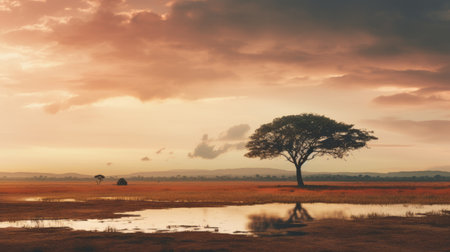 a lone tree stands tall in a grassy space, reminiscent of traditional arts from africa, oceania, and the americas. created using unreal engine, the scene is bathed in a soft palette of light pink and amber. flowing silhouettes and secluded settings add to the ambiance, while hyper-realistic animal illustrations bring a touch of junglecore to this captivating image. ai generated