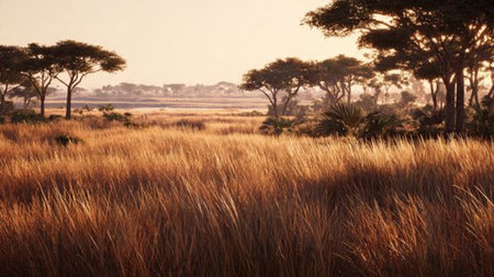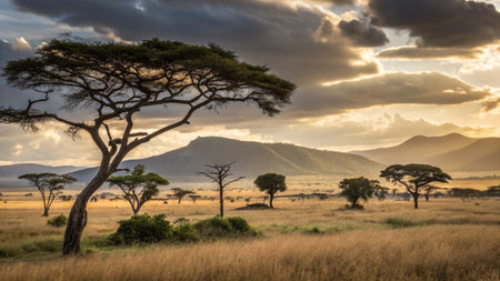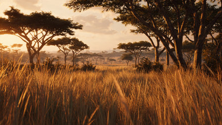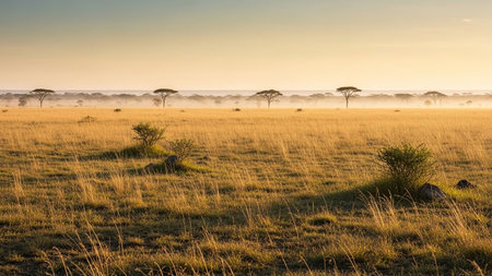 A breathtaking panorama of the African savanna at sunrise, showcasing a golden sky, lush vegetation, and a gentle haze creating a serene atmosphere