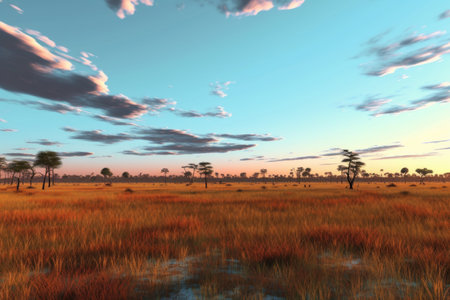 wide-angle shot of vast savanna plains at dusk, created with generative ai