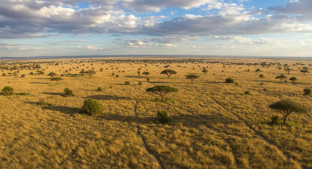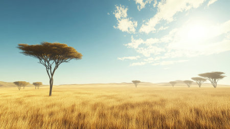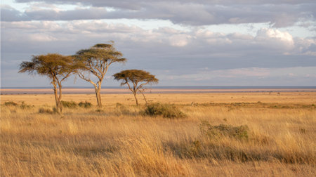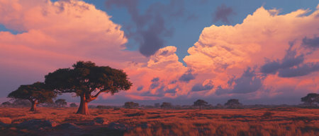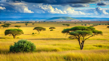 Stunning view of golden grasslands featuring scattered trees under a vibrant sky with fluffy clouds, embodying the serene beauty of the African savannah landscape.